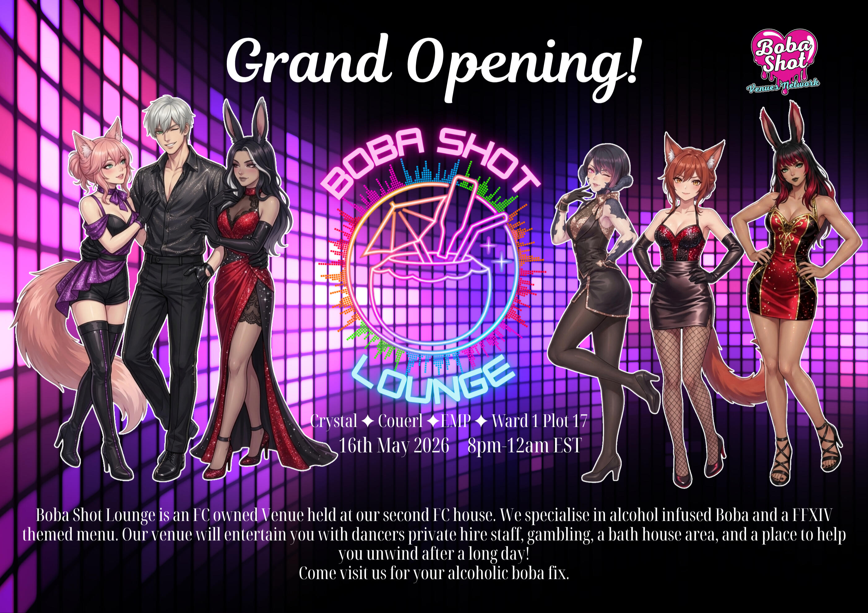 Our venue is an 18+ venue. Please do not come to the venue if you are under 18 as some activities are not suitable for younger audiences.Boba Shot Lounge is an FC owned Venue held at our second FC house. We specialise in alcohol infused Boba and a FFXIV themed menu. Our venue will entertain you with dancers private hire staff, gambling, a bath house area, and a place to help you unwind after a long day in our baths!